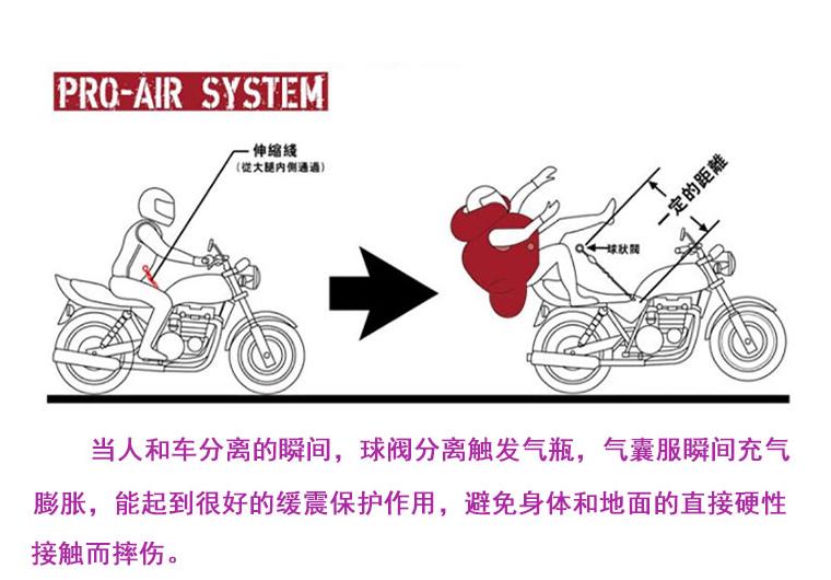 环裘气囊骑行服 环裘气囊马甲是针对国内摩托玩家而生,马甲材料为600D加厚密纹帆布,在保证美观的同时耐磨耐刮耐刺,在较轻的事故中可以很好地保证完善性,重复使用性。摩托车事故一般以擦伤,撞伤为主,在佩戴头盔,骑行服穿戴完整的情况下,可以避免大部分头部和四肢的擦撞伤,而胸部.肩部和背部是属于保护薄弱部位,而这件专用的气囊背心,可以做好很好的保护补充作用,在遇到险情时,骑手飞出摩托车到落地这期间内,气囊安全阀发生作用,0.3S内气囊会打开,在落地之前就可以对骑手起到最大程度上的保护,而且可以多次使用。 气囊背心重量样式都和普通反光背心相仿,可以重复利用,结构由气囊背心主体,高压气罐,安全阀,在安全气囊作用一次之后,如果背心在没有破损的情况下,更换高压气罐即可再次使用,使用成本非常低廉。 本产品已通过了国家公安部认证且获得了国家3A级权威检测中心的质量合格检测。