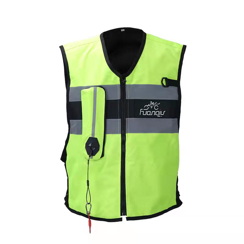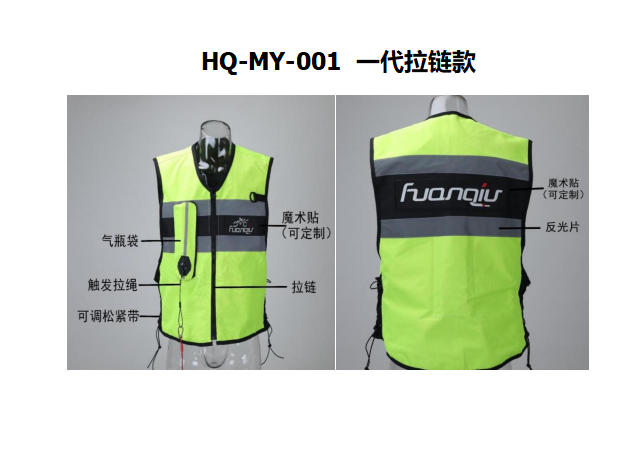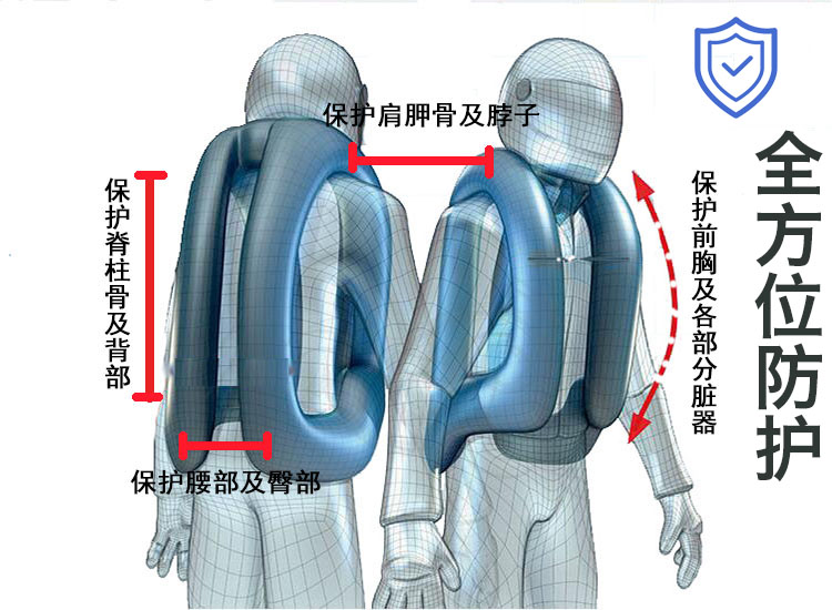 环裘气囊马甲是针对国内摩托玩家而生,马甲材料为600D加厚密纹帆布,在保证美观的同时耐磨耐刮耐刺,在较轻的事故中可以很好的保证完善性,重复使用性。摩托车事故一般以擦伤,撞伤为主,在佩戴头盔,骑行服穿戴完整的情况下,可以避免大部分头部和四肢的擦撞伤,而胸部.肩部和背部是属于保护薄弱部位,而这件专用的气囊背心,可以做好很好的保护补充作用,在遇到险情时,骑手飞出摩托车到落地这期间内,气囊安全阀发生作用,0.08S内气囊会打开,在落地之前就可以对骑手起到最大程度上的保护。